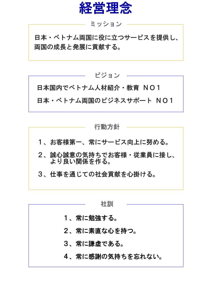 設立時のスタッフ7人は、日本の大学・大学院にて専門知識を学び、「日本流のビジネス」についてもその後の長期にわたる日本での生活で習得しています。 当然、母国ベトナム流のビジネスについても熟知していますので、日本~ベトナム間の良き仲介者としてお役に立てるものと思います。その上で、新たな事業を創造する挑戦意欲と社会貢献に対する強い気持ちを持って事業を運営しています。 経済面だけではない"文化と経済の交流"、そして一方的な利益に陥らない"相互利益の創造"を事業経営の理念として、日本とベトナム国間でビジネスを展開して参ります。